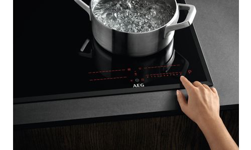 Door de kookplaat in te schakelen en een pan neer te zetten, licht de schuifbediening met leds automatisch op. Intuïtief wordt aangegeven welke zone in gebruik is. Zo plaatst u de pan steeds op de juiste zone en beleeft u de volle kracht van koken met AEG.