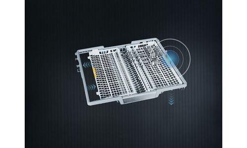 Wij hebben de besteklade verbeterd: nu kunt u ook kleine serviesonderdelen, zoals espressokopjes, in de besteklade van uw vaatwasser plaatsen. De 3D-MultiFlex-ladebestaat uit een verlaagd midden- en twee zijgedeelten. Het linker gedeelte kan naar rechts worden geschoven om hoge wijnglazen in het bovenste rek te kunnen plaatsen. In het rechter in hoog te verstelbare gedeelte plaatst u eenvoudig grote bestekonderdelen en kleine serviesonderdelen.