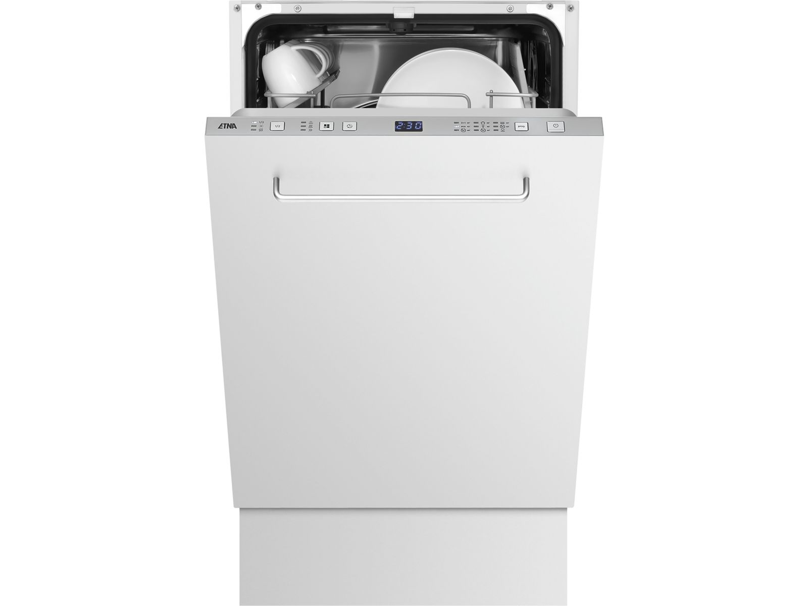 De ETNA VW47SM geïntegreerde vaatwasser is met een breedte van 45 cm bescheiden in formaat maar royaal in comfort en gemak. Zo heeft de vaatwasser maar liefst negen verschillende programma’s, variërend van snel spoelen tot eco of juist intensief. Daarnaast geeft de vaatwasser je keuze uit vijf reinigingstemperaturen, in te stellen op het RVS bedieningspaneel. De VW47SM biedt ruimte aan negen couverts maar de E vaatwasser is ook op halve belading in te stellen wanneer je wat minder afwas hebt. De start van een wasprogramma is tot 24 uur uit te stellen, zodat alles klaar is wanneer het je het beste uitkomt. De vaatwasser controleert automatisch of er voldoende zout en glansmiddel is en heeft een digitaal display met resttijdindicatie. Tot slot droogt deze luxe vaatwasser met restwarmte, wat energie bespaart en bovendien sneller is.