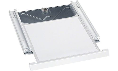 Verbindingsstuk voor was/droogzuilen met werkblad voor veilige opstelling bij een was/droogzuil.