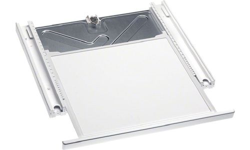 Verbindingsstuk voor was/droogzuilen met werkblad voor veilige opstelling bij een was/droogzuil.