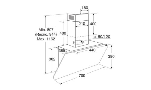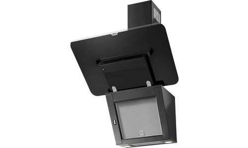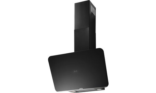 Het design van deze diagonale schouwkap mag gezien worden. Deze compacte schouwkap heeft een breedte van slechts 70 cm. Opvallend is het karakteristieke design in matzwart met een front in zwart glas en afgeronde hoeken.