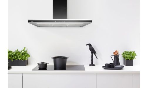 Deze slanke schouwkap met strak glazen front is een echte eyecatcher in je keuken.