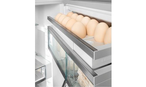 In hoogte verstelbare deurvakken met gehard glazen bodem, edelstalen steunrails en verschuifbare flessen- en conservenhouders maken een optimale indeling van de deur mogelijk. De deurvakken zijn groot genoeg voor 2 liter verpakkingen.