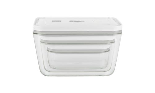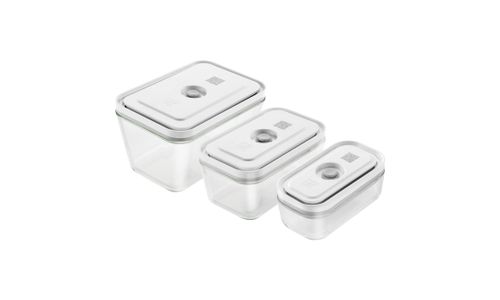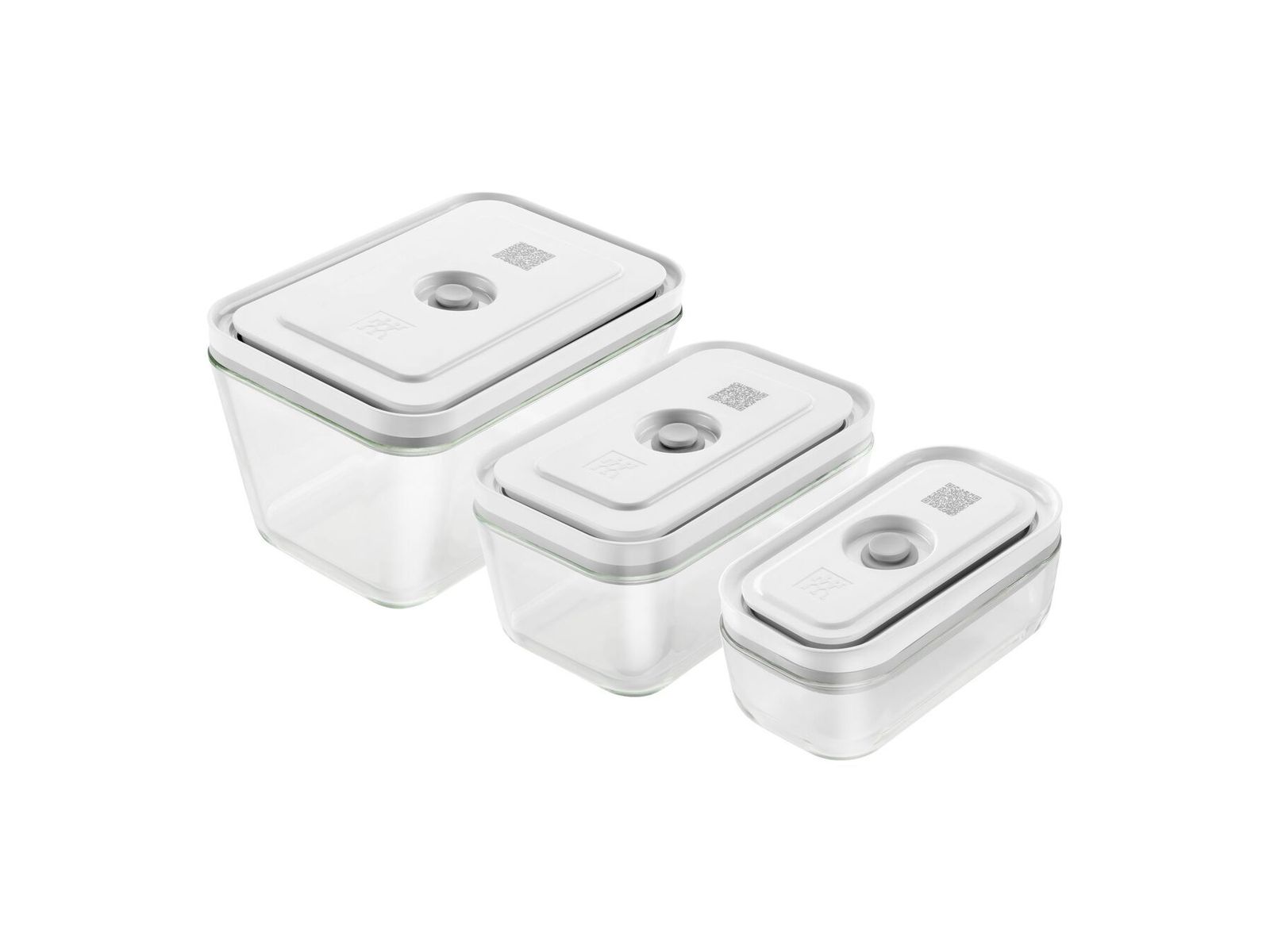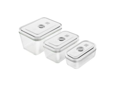 Set bestaat uit 3 glazen containers (inhoud (zonder deksel) / max. vulniveau: S-container 0,35 l / 0,2 l, M-container 0,9 l / 0,75 l, L-container 2 l / 1,6 l)