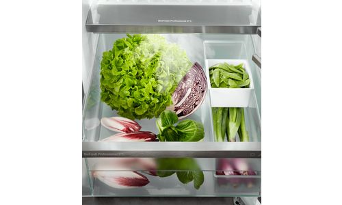 Het SmartSteel interieur met LightTower en Ambient verlichting wordt optimaal verlicht. In de BioFresh Professional laden op SoftTelescopic rails blijven groenten en fruit tot 3x langer vers. Voor een maximale versheid wordt regelmatig een frisse nevel over groente en fruit verspreid. De InfinitySpring waterdispenser met vaste wateraansluiting is naadloos geïntegreerd in de binnenwand. De deur met SoftSystem sluit altijd zacht en met het Touch & Swipe kleurendisplay kunnen alle functies en temperatuurinstellingen eenvoudig worden bediend. Dankzij zijwandverwarming zonder kans op condensatiepro