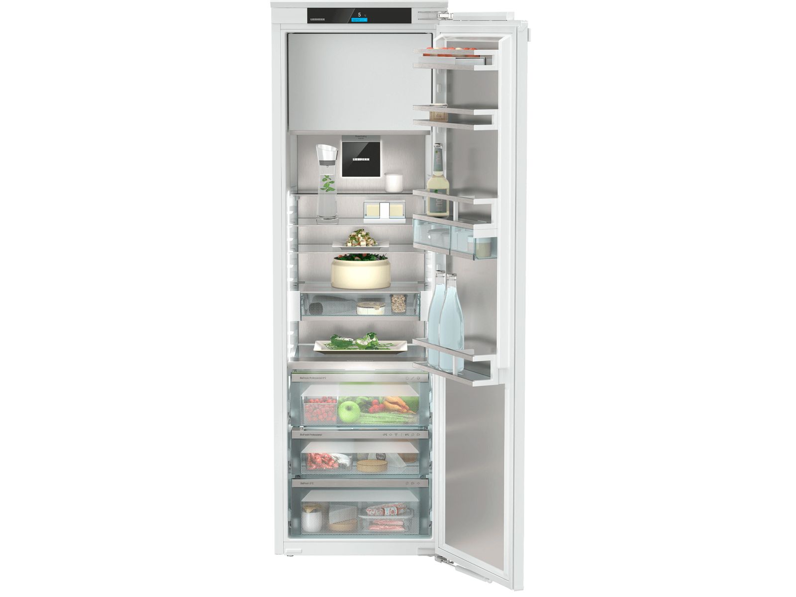 Deze inbouwkoelkast met vriesvak biedt alles. Het SmartSteel interieur is hygiënisch en geeft een professionele uitstraling. De LED wandpanelen en ambient verlichting zorgen dat niets aan uw oog ontsnapt. De deur met SoftSystem sluit altijd zacht en in de BioFresh Professional laden op SoftTelescopic rails houdt u groenten en fruit tot 3x langer vers. Voor een maximale versheid wordt een frisse nevel over de groente en fruit verspreid. Vis en zeevruchten blijven in de Fish & Seafood-safe extra lang vers.