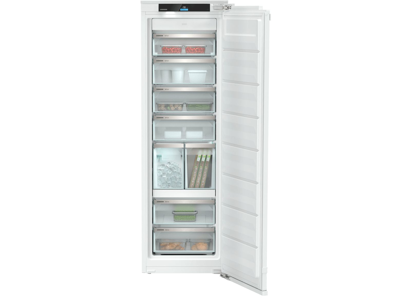 De deur is met uw stem of door te kloppen volledig te openen en te sluiten en deze NoFrost vrieskast hoeft u nooit te ontdooien. Met het Touch & Swipe kleurendisplay worden alle functies bediend en de goed verlichte telescopische laden kunnen volledig worden uitgetrokken. De uittrekbare IceTower biedt een ijsblokjesvoorraad van 5,7 kilo en wordt dankzij de vaste wateraansluiting continue aangevuld. Met de warmewand is deze vriezer zonder condensproblemen naast een inbouw koeler of wijnkast te plaatsen.