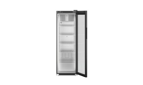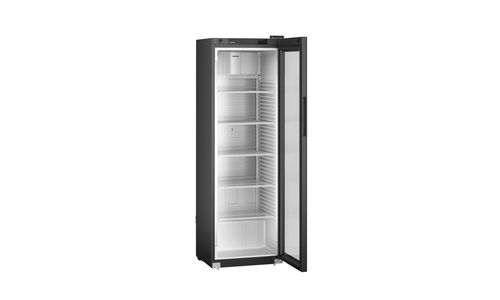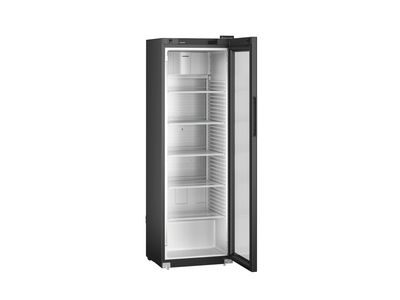 Deze zwarte Liebherr flessenkoelkast heeft een temperatuurbereik van -2°C tot +15°C. De deur sluit vanzelf waardoor een openstaande deur tot het verleden behoort. Voor het comfortabel vullen van de koelkast blijft de deur bij een openingshoek van meer dan 90° open staan. Plafondverlichting zorgt dat de inhoud altijd goed zichtbaar is. De versterkte draagroosters met geïntegreerde uittrekstop zijn belastbaar tot 45 kg en de temperatuur kan direct via het digitale display in de deur worden afgelezen.