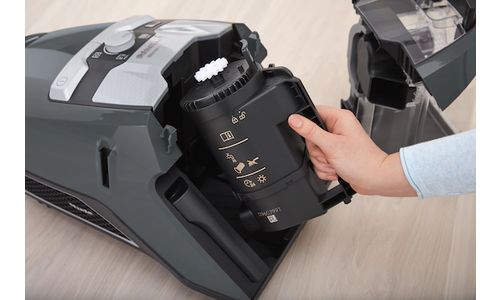 Het hoge vermogen van de speciaal ontworpen motor en de extreem hoge stromingssnelheid zorgen voor een uitstekende scheiding van grof vuil en fijn stof in aparte reservoirs. Bij het legen van de reservoirs zal zeer weinig stof naar beneden dwarrelen. Het innovatieve principe is door het IBR-instituut getest op de bijzonder hygiënische manier van legen.