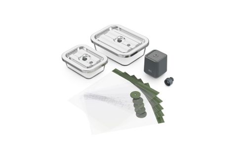 vacuum Fresh all in one kit: 1 pomp, container 650ml, container 1500ml, 5 herbruikbare vacummerzakken, 1 vacumeer wijkurk, oplader