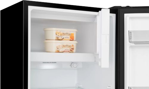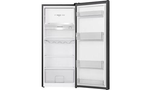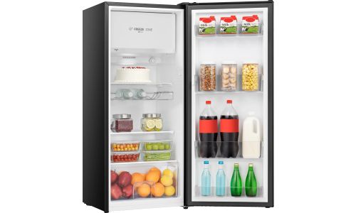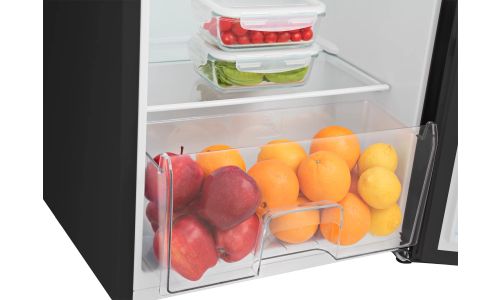Hoewel de KVV228ZWA iets groter is dan een standaard tafelmodel, biedt hij nog steeds voldoende ruimte met een koelgedeelte van 150 liter en een vriesvak van 15 liter. De koelkast is voorzien van drie stevige glazen plateaus, een handig liggend flessenrek en een transparante groentelade, allemaal verlicht door heldere LED-verlichting.