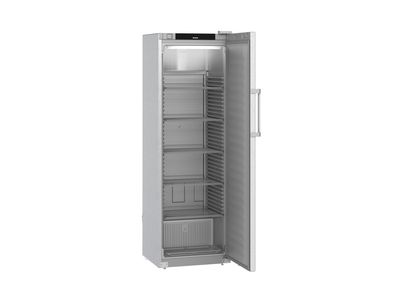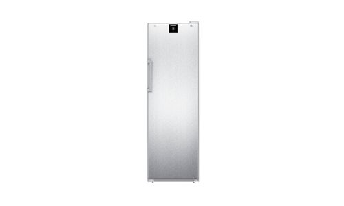 De slanke handgreep biedt toegang tot het eenvoudig te reinigen interieur van deze roestvrijstalen koeler. Bij een 90° openingshoek blijft de automatisch sluitende deur open staan voor gemakkelijk in- en uitladen. Het LightAlarm waarschuwt wanneer de deur te lang open staat en LED-verlichting zorgt voor optimaal zicht op de opgeslagen producten. Het apparaat is logisch te bedienen met het digitale aanraakdisplay. De luchtvochtigheid wordt geregeld via de HumidityControl en de dynamische koeling biedt een gelijkmatige temperatuur in de koeler waardoor het vinden van een lege plek eenvoudig is.