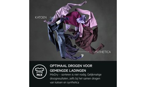 MixDry droogt moeiteloos, grondig en gelijkmatig synthetische en katoenen kledingstukken zonder overmatig of te weinig drogen. Sorteren overbodig. De warmtepomptechnologie garandeert dat je wasgoed de exacte hoeveelheid warmte krijgt, waardoor het energieverbruik laag blijft.