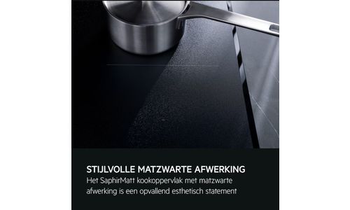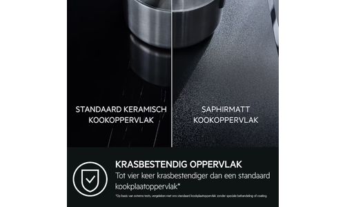 Het SaphirMatt®-glas biedt superieure bescherming tegen krassen in vergelijking met onze standaard keramische kookplaten. De elegante zwarte matte afwerking is bestand tegen vingerafdrukken en vlekken – waardoor jouw kookplaat er langer als nieuw blijft uitzien.