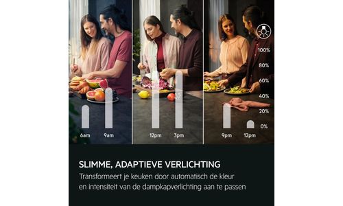 De 8000 AuroraTech® afzuigkap introduceert slimme verlichting in je keuken. Het past automatisch de kleur en intensiteit van de verlichting aan op basis van het tijdstip van de dag, waardoor de perfecte sfeer ontstaat. Gebruik de app voor de slimme lichtervaring.