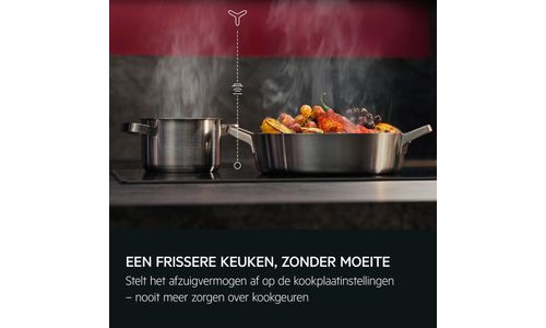 De Hob2Hood®-functie activeert draadloos de verlichting van de afzuigkap wanneer je de kookplaat inschakelt. Wanneer je begint met koken, wordt de ventilatorsnelheid geregeld op basis van de warmte-instellingen op de kookplaat. Kook heerlijke maaltijden zonder zorgen over geuren en dampen.
