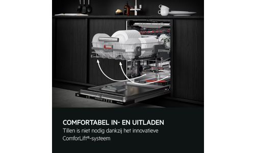 De nieuwe Comfortlift-vaatwasser van AEG is uniek: het is de eerste ter wereld die het onderste rek omhoog kan laten komen. Uw glanzende vaat en pannen worden behoedzaam naar een aangename werkhoogte gebracht; zodat u efficiënter kunt in- en uitladen. Met Comfortlift hebben we wassen in de vaatwasser naar een geheel nieuw niveau getild.