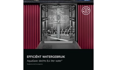 AquaSave, ons vernieuwde watersysteem, activeert de sproeiarmen afzonderlijk en stuurt het water alleen naar waar het nodig is. Zo daalt het waterverbruik tot slechts 8,4 liter, zonder in te leveren op reinigingsprestaties.