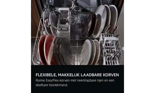 De vernieuwde EasyFlex-korven glijden soepel en hebben antislip rubberen noppen om glaswerk en delicate spullen te beschermen. Twee rijen zijn opklapbaar voor grote of ongewone items. De bestekmand is deelbaar voor extra flexibiliteit.