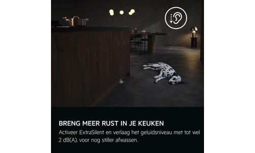 Wanneer je extra rust in de keuken wilt terwijl de vaatwasser draait, activeer je ExtraSilent via het bedieningspaneel of de app. Het verlaagt het reeds lage geluidsniveau van het 90- of 120-minutenprogramma met nog eens 2 dB.