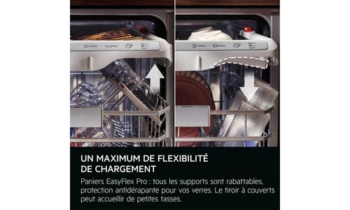 De EasyFlex Pro-korven glijden soepel en zijn volledig inklapbaar voor maximale flexibiliteit. Antislip rubberen houders en noppen houden glazen en wijnglazen stevig op hun plek en voorkomen botsingen. De besteklade biedt ruimte voor kloppers, soeplepels en kleine kopjes.