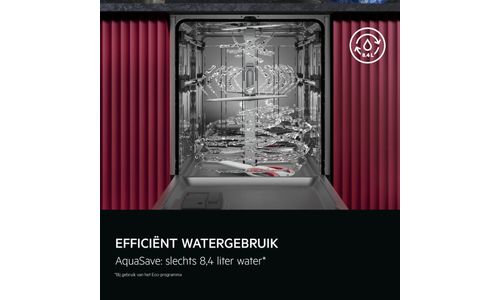 AquaSave, ons vernieuwde watersysteem, activeert de sproeiarmen afzonderlijk en stuurt het water alleen naar waar het nodig is. Zo daalt het waterverbruik tot slechts 8,4 liter, zonder in te leveren op reinigingsprestaties.