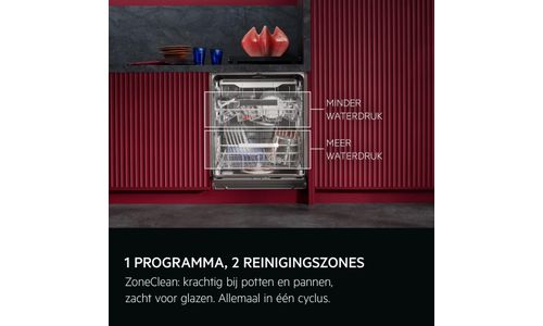 Activeer ZoneClean om de waterdruk in de sproeiarmen te verhogen voor het grondig reinigen van potten en pannen in het onderste rek, de druk in het bovenrek blijft laag voor delicate glazen. Twee zones, zonder extra water- of energieverbruik.