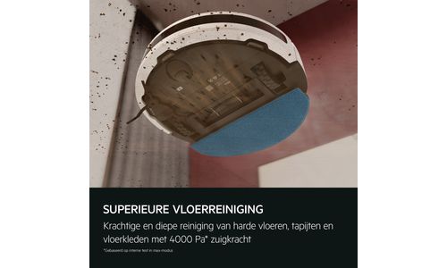 De indrukwekkende zuigkracht van 4000 Pa* van de robotreiniger is ideaal voor alle vloeren, van hout of tegels tot tapijten en vloerkleden. Fijn stof, haren van huisdieren en grotere stofdeeltjes** worden gemakkelijk opgevangen, voor geweldige schoonmaakresultaten.