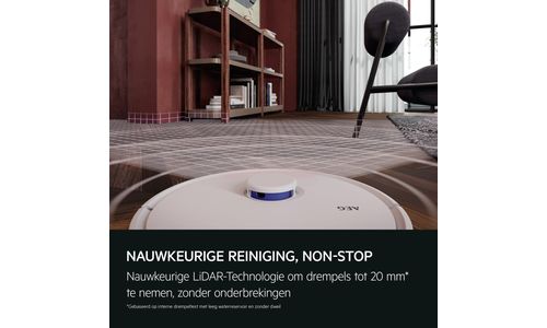 Dankzij nauwkeurige Lidar-kaarten van je huis kun je het schoonmaken helemaal naar wens aanpassen. Ergonomische wielen navigeren over drempels van 20 mm* hoog, en geïntegreerde afgrondsensoren voorkomen het vallen**, waardoor een optimale reiniging wordt gegarandeerd die uniek is afgestemd op de indeling van elke ruimte.