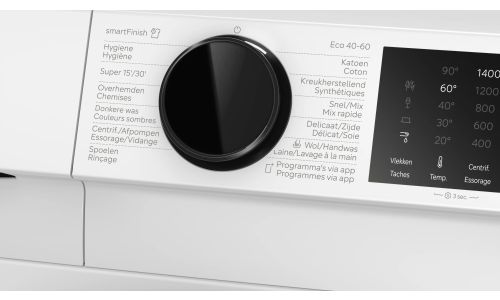 Raakt je droge was snel gekreukt? Dan is het smartFinish-programma van je wasmachine precies wat je nodig hebt. Het voegt een kleine dosis stoom toe die kreukels tot 50% vermindertVoetnoot 6: Test nr. E-0323-PT-22 van het Deutsche Institut für Textil- und Faserforschung Denkendorf (DITF) van 12.07.22, met betrekking tot de kreukreductie in commerciële katoenen kleding (T-shirts en business shirts) in het smartFinish programma volgens DIN EN ISO 15487 in vergelijking met textiel dat niet behandeld is met smartFinish.6 en beperkt zo je strijkwerk. Met smartFinish zijn zelfs sterk gekreukte kledingstukken al een stuk gladder binnen 23 minuten. Van een helpende hand gesproken