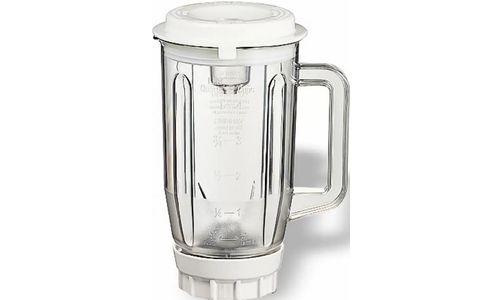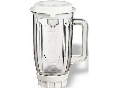 Mixerbeker uit kunststof. Inhoud: 1,4 l. Mixerbeker met maataanduididing. Deksel met vulschacht. Tevens geschikt voor het ' crushen ' van ijsblokjes en het hakken van bevroren fruit en groeten.