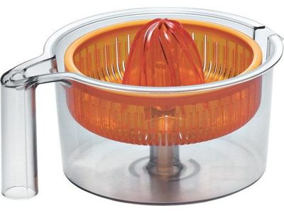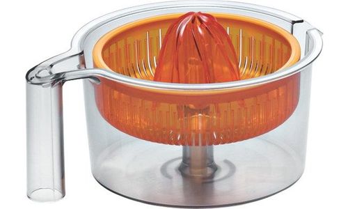 Citruspers. Zeefkorf met perskegel en opvanschaal. Voor het uitpersen van appelsienen, citroenen en pompelmoezen.